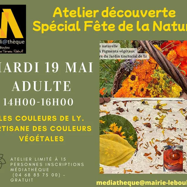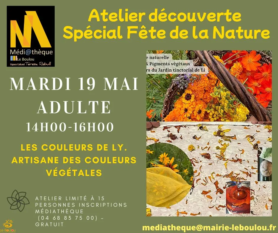 Dans le cadre de la fête de la nature, la médiathèque vous invite à participer à un atelier découverte de teintures textiles et aquarelles végétales animé par magali artisane des couleurs végétales. Magali Martinez, cultive, transforme des fleurs tinctoriales de son jardin, et des ressources naturelles locales, pour créer des teintures textiles et des aquarelles végétales. Sa pratique s’inscrit dans une démarche artisanale, avec une approche sensible, respectueuse du vivant et des savoir-faire anciens qui méritent d’être redécouverts et partagés. Inscription obligatoire jusqu'au 13 mai 2026 17h00.Places limitées à 15 personnes.Gratuit